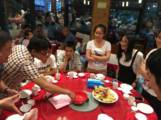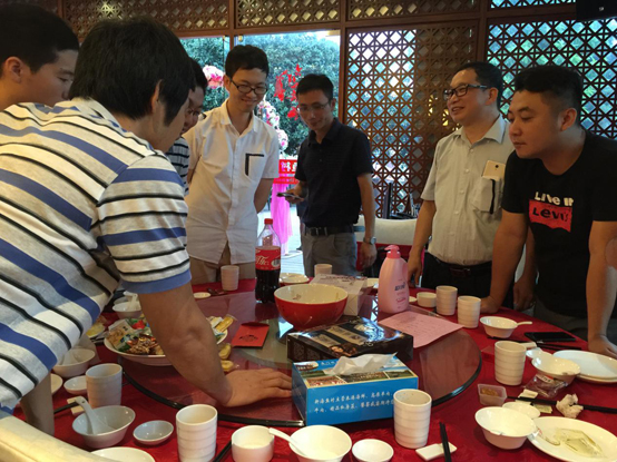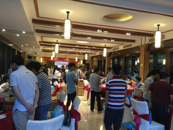 当晚,伴着主持人曾怡航“开博”的一击铜锣声,十三个博饼瓷碗里的骰子同时响起。第一轮博饼开始,全场骰子声叮叮当当,一秀、二举、四进、三红、对堂、状元相继出桌,现场的气氛一次次推向热潮,整个会场成了一片欢喜的海洋,桌上的礼品也悉数被员工收入囊中。经过第一轮猛烈初赛爆发的13名桌状元加入到第二轮的“状元王中王”争夺赛,争夺最后的大奖,经过猛烈的角逐,王中王由来自四川的一位嘉宾幸运地博到。台下围观的员工们欢声笑语,共享美酒佳肴,其乐融融。