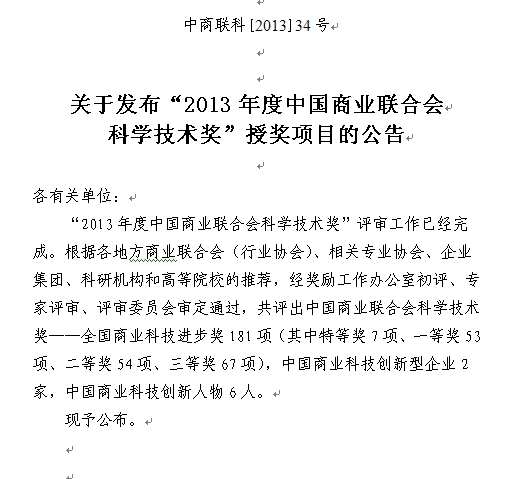 公司《大挠度下钢筋混凝土板的受拉薄膜效应》项目荣获2013年度中国商业联合会科学技术奖——全国商业科技进步奖一等奖。
